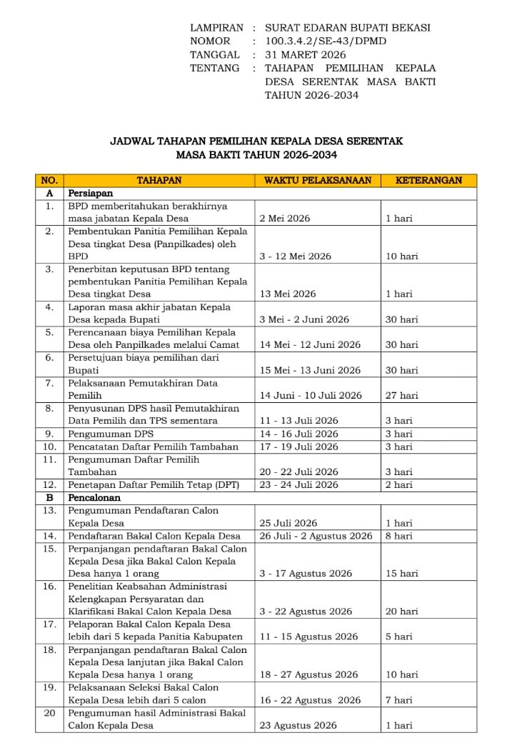 Pelaksanaan Pilkades tersebut mengacu pada Surat Edaran Bupati Bekasi Nomor 100.3.4.2/SE-43/DPMD tertanggal 31 Maret 2026.