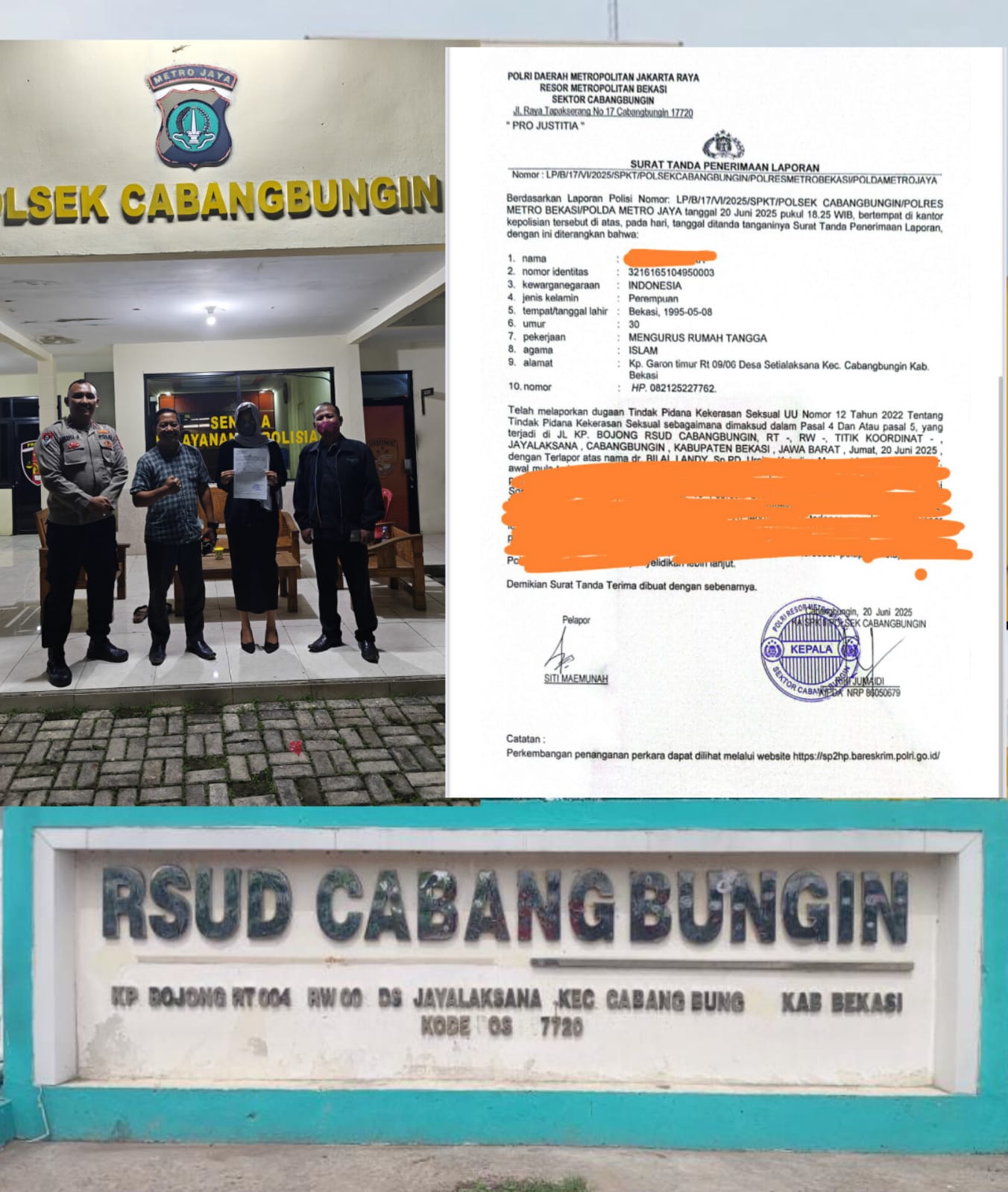 Laporan resmi telah diterima oleh Polsek Cabangbungin dengan nomor LP/B/17/VI/2025/SPKT/POLSEK CABANGBUNGIN/POLRES METRO BEKASI/POLDA METRO JAYA.